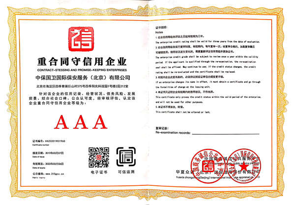 中保國衛(wèi)國際保安服務(wù)(北京)有限公司,屬中保國衛(wèi)集團(tuán)旗下子公司。能全方位的為大型客戶提供優(yōu)質(zhì)的安保、押運(yùn)服務(wù),是集人防和技防于一體的新型正規(guī)化綜合安保押運(yùn)服務(wù)企業(yè),提供人防、物防、技防、聯(lián)網(wǎng)報(bào)*、非武裝押運(yùn)等安防相關(guān)的一站式服務(wù)。 公司在國內(nèi)多省設(shè)立有分公司及分支機(jī)構(gòu),著重提升安全押運(yùn)、智能技術(shù)押運(yùn)及安全技術(shù)防范相關(guān)的服務(wù),業(yè)務(wù)范圍覆蓋全國一、二線城市、港澳地區(qū)以及海外地區(qū)。安保方面主要為政府機(jī)構(gòu)、金融機(jī)構(gòu)、企事業(yè)單位、醫(yī)療衛(wèi)生、高等院校、工業(yè)園區(qū)、大型商場、高檔住宅、智能商務(wù)樓、大型活動提供門衛(wèi)、守護(hù)、巡邏、押運(yùn)(非武裝)、安全檢查、保安特勤、私人護(hù)衛(wèi)、消防中控、安全技術(shù)防范、遠(yuǎn)洋護(hù)航等全方位服務(wù),同時(shí)面向國際市場,為中資企業(yè)在“一帶一路”沿線國家投資提供境外安保服務(wù)。 >> 更多內(nèi)容 |